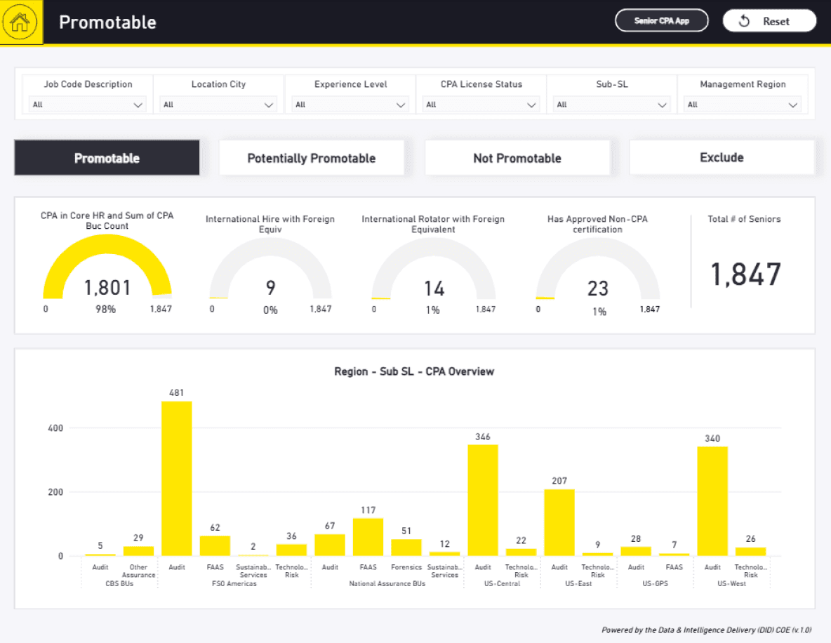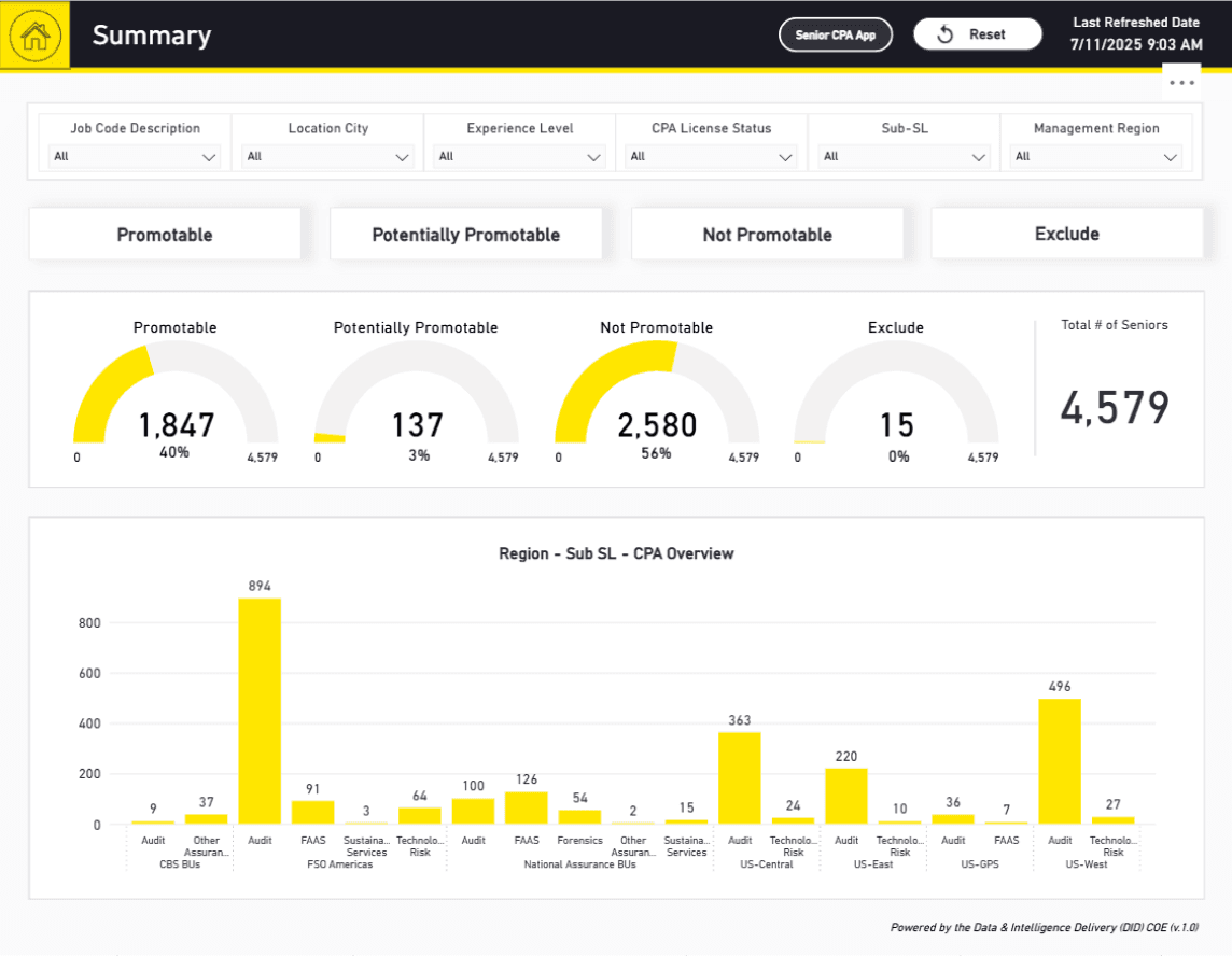 I worked on redesigning a CPA (Certified Public Accountant) Status Dashboard used by hiring teams to track promotion eligibility based on CPA completion. This project allowed me to expand my skills by directly implementing design updates in Power BI and collaborating closely with engineers and data analysts.